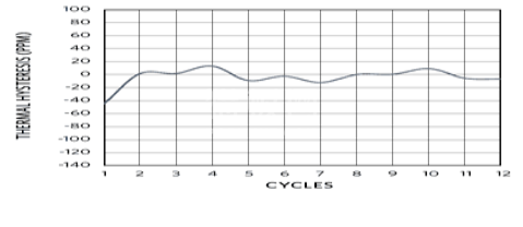 热滞现象的形式正式定义为在整个工作温度范围内器件循环之前和之后,环境温度(+25°C)下输出电压的变化。电压基准电路中的热滞通常以ppm /°C为单位进行测量。这是输出参考电压由于在间隔ΔT内的温度循环而变化的量。实际上,当温度在整个ΔT内循环时,这是参考电压电路输出电压的永久变化。