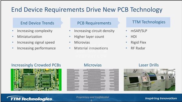 “高密度互连板(HDI)上线宽线距已经小于80微米,最早应用于手机和平板,过去七八年,这种技术已经从移动设备普及到台式机、汽车电子中的影音娱乐与摄像头模块,以及国防航空领域。”艾德曼指出,80微米并非极限,已经有客户要求30微米以下的线宽线距,“为实现30微米以下的线宽线距,TTM加大了在半加成法(Modified Semi-Additive Process)与类载板(Substrate Like PCB)等技术上的投入,我对TTM开发新技术以满足小型化需求的进度非常乐观。”