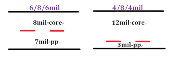 这两种叠层有什么不一样吗?不就是用不一样的PP和CORE来凑够厚度吗?如果你们算阻抗的话,你就会发现它们最大的区别了。