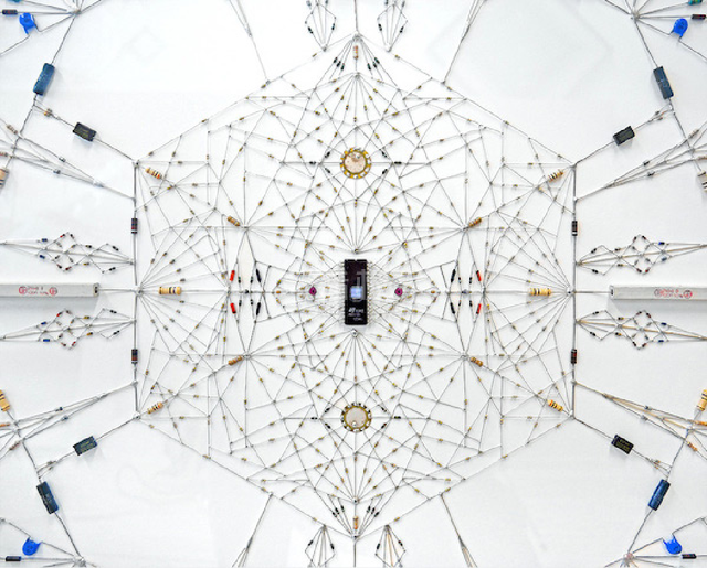 电路画被艺术家玩转了,艺术家Leonard Ulian将他的创作称为「Technological mandala」,其中mandala一词来自梵文,中文常被译成曼陀罗、曼荼罗,原义是圆形的意思。在印度教和佛教的艺术中常能见到曼陀罗的踪影,其特色是中心有一个明显的主体,图形与花纹向外发散,并且呈现对称的型态,看起来相当複杂,但却十分的有秩序,就像是宇宙的运行一般。