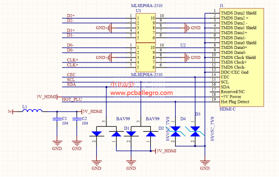 HDMI C Type、HDMI D Type;除HDMI B 有29个脚外,其它类型都是只有19个脚,今天我们就一起来学习HDMI C Type的电路设计: