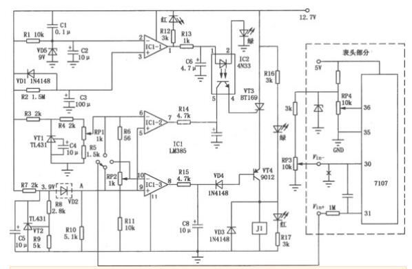 VD2为温度传感器,它由5只二极管1N4148串联而成。由图可见,A点电位将随传感器VD2所测到的温度呈正比变化。温度每升高1℃,VD2的正向压降减小约12mV。电位器RPl设定上限温度值(压缩机启动),电位器RP2设定下限温度值(压缩机停止),两者之间为温差,最小温差可调到0.5℃。延时电路与比较器输出端用IC2光电耦合器隔离,可提高电路的可靠性。温度显示表头选用μP5135A型(表头部分见图中虚线框内)。